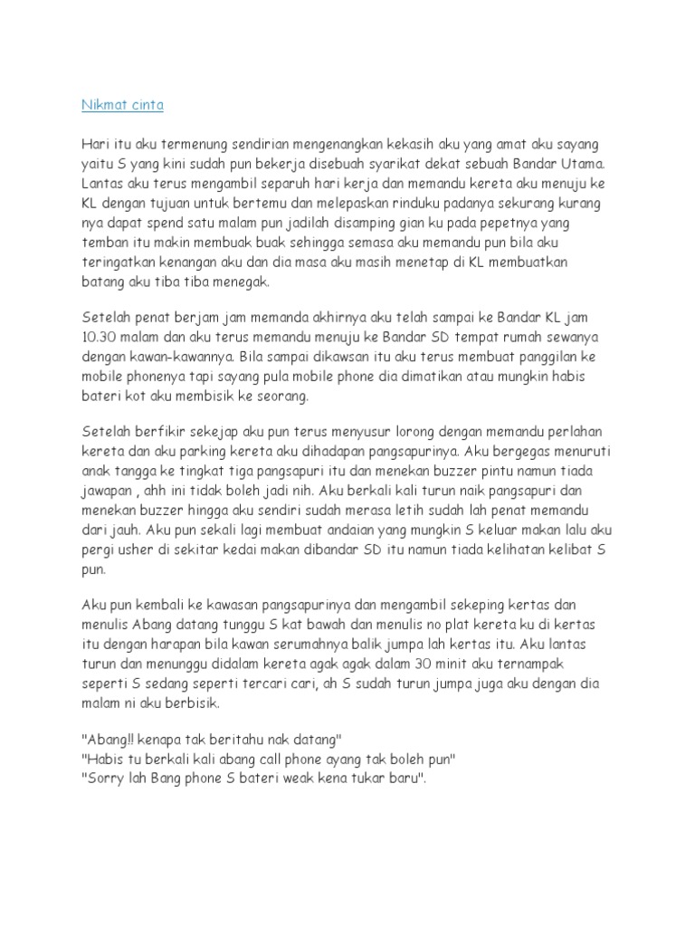 Tapi hari ni baru cerpen. Amboi cik abang… tak sampai setengah jam isteri dia dalam ofis ni, dia dah tak senang duduk dalam kereta tu. Kata ibu yang memperkenalkan aku pada adik tiriku. Ma dan pa sudah lama berdengkur. Sampai saat ini abang susah nak percaya bahawa hani dalam diam tergamak selingkuh di belakang abang.