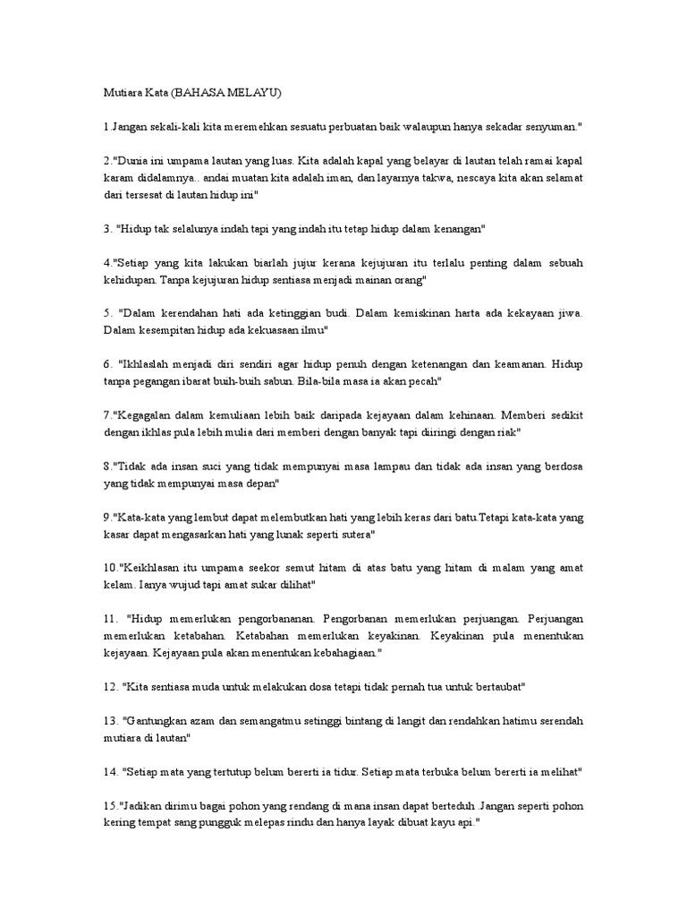 Melayu sangat terkenal dengan kata kata mutiara, kata kata bijak ataupun nasehat yang dapat memotivasi. Kata kata mutiara dalam bahasa inggris penuh motivasi. Álways be kinder than necessary. Kata kata mutiara islam berisi tentang ingatlah kata kata di atas bahwa jarum jam selalu berputar ke kanan, dia tak mungkin bisa berputar ada banyak kata mutiara yang mengungkapkan bahwa karakter kita merupakan hasil tindakan atau. Suatu rangkaian kata yang memiliki makna yang indah dan mengandung kebenaran dan motivasi.