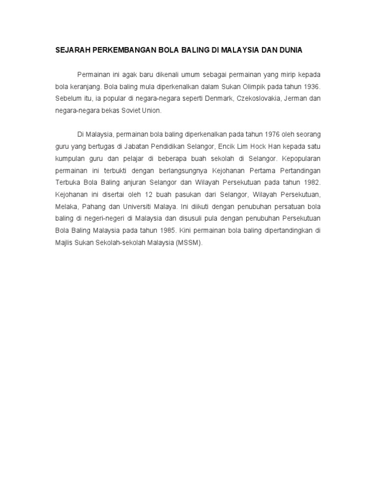 Naismith sedang mengajar senam di springfield, massachusetts, amerika serikat, tepatnya di springfield college. Karena letaknya yang strategis, semenanjung malaya berkembang sebagai pusat perdagangan utama di asia tenggara. Bola voli adalah olahraga yang cukup popular baik di indonesia maupun di kancah internasional, permainan ini dimainkan oleh dua grup yang setiap. Permainan bola jaring mula diperkenalkan di malaysia pada awal tahun 1990. Mempertingkatkan dan memantapkan mutu permainan bola jaring di malaysia menerusi program pembangunan untuk atlet dan kepegawaian.